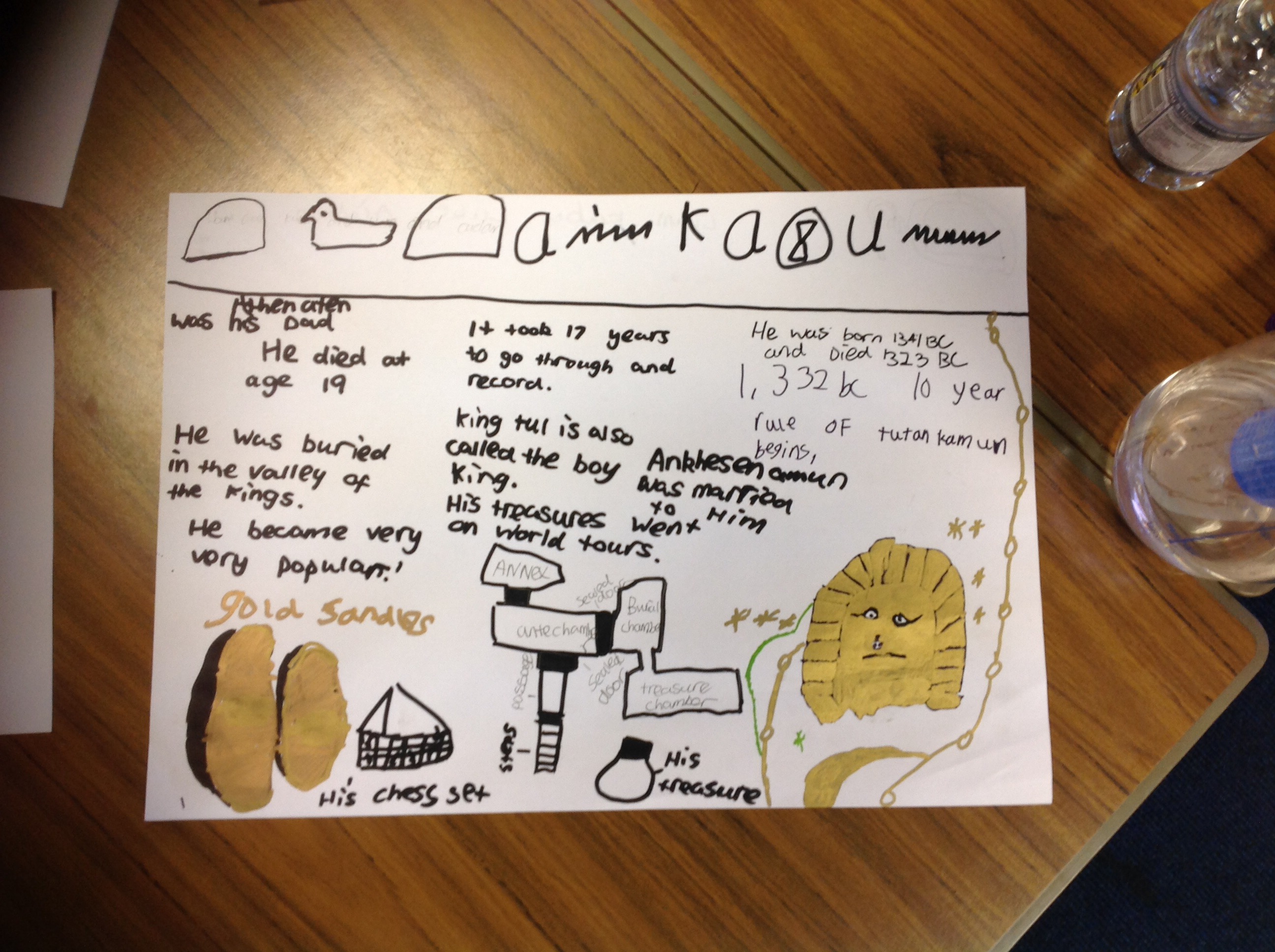 This week in our Egyptian lesson we learnt all about Pharaohs and their role in ancient Egypt. Some Pharaohs we learnt about were Ramses 11 and Tutankhamen. King Tut was the most popular King during the Egyptian times. He was also known as ‘The Boy King’ because he became King when he was only 9, and passed away when he was 18/19. His father was King before him, but was not popular with he people of Egypt because he tried to change many of the laws. King Tut restored Egypt to its original self. We made our own information sheets King Tut: