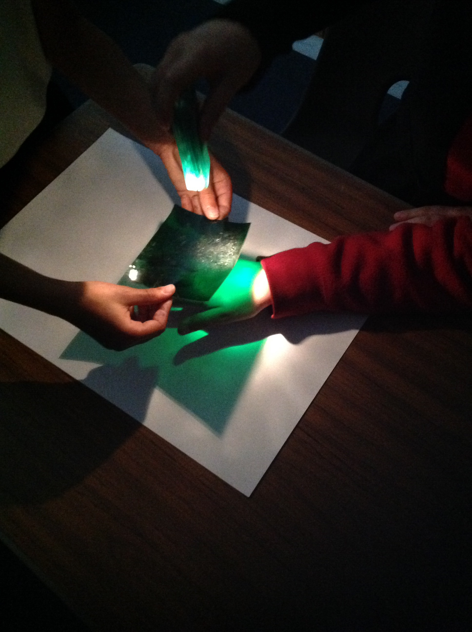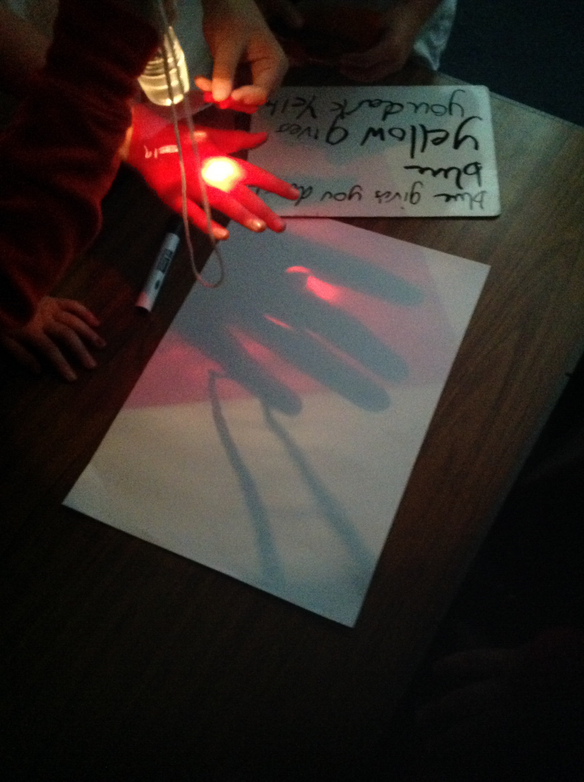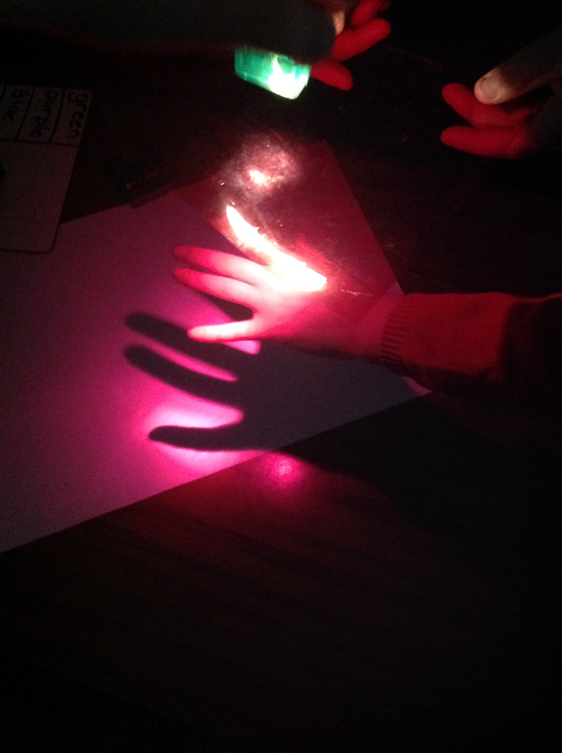This term in topic we are looking at our world. We are doing a lot of science experiments to help us discover new things about light. In this experiment we were looking at our shadows through different coloured lights.