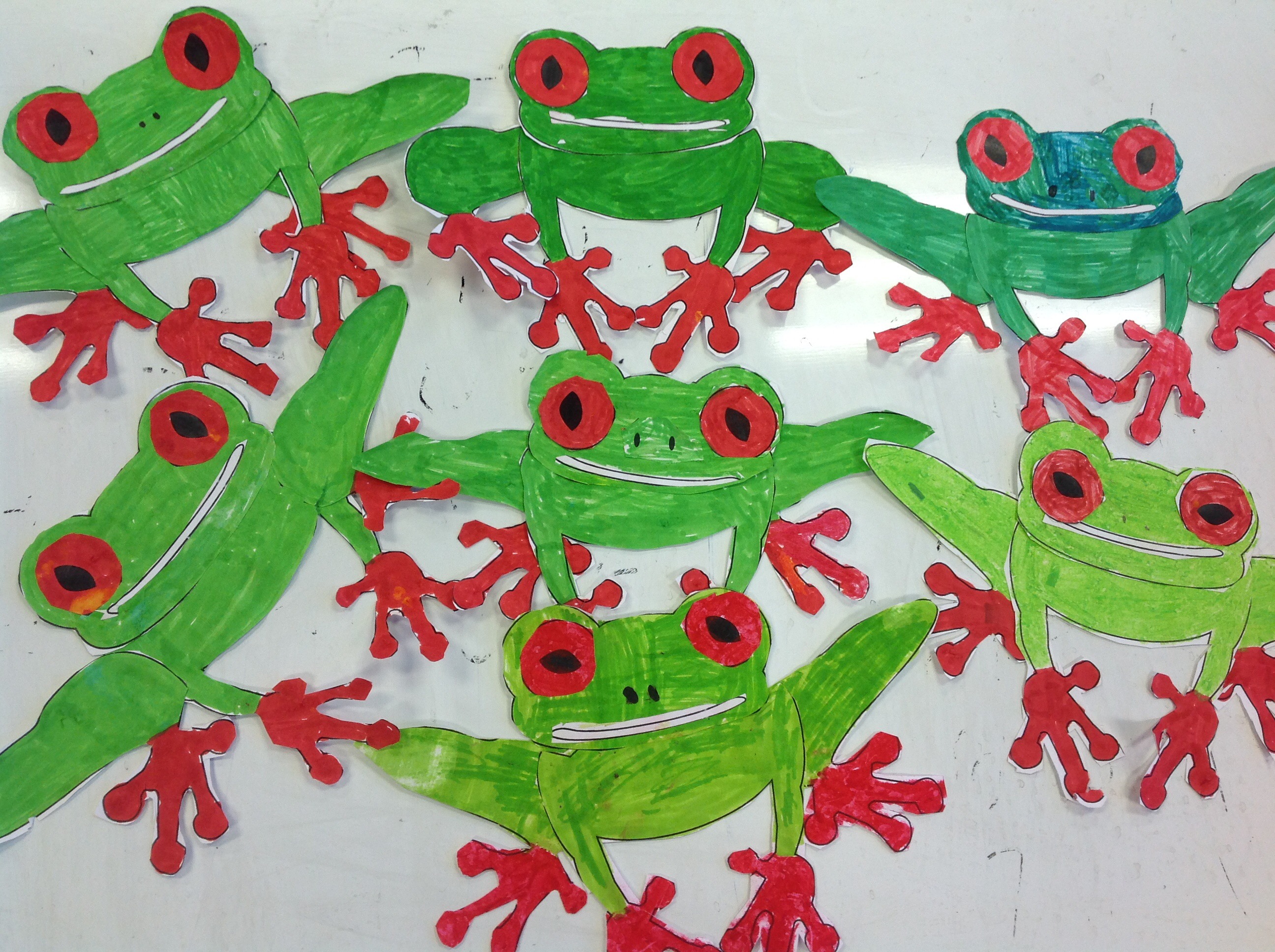 This week in art we made our first paper red eyed tree frogs. We’re getting better at colourings and cutting out.